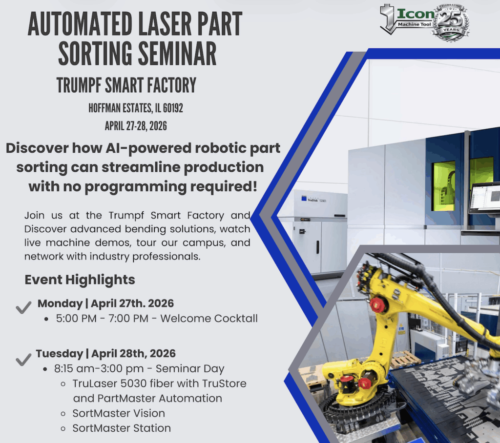 TRUMPF is hosting an TRUMPF Automated Laser Part Sorting Seminar on April 27-28, 2026 at their Smart Factory in Hoffman Estates, IL. This is your chance to see how SortMaster Vision uses optical image recognition to detect and sort your laser‑cut parts. No programming required!