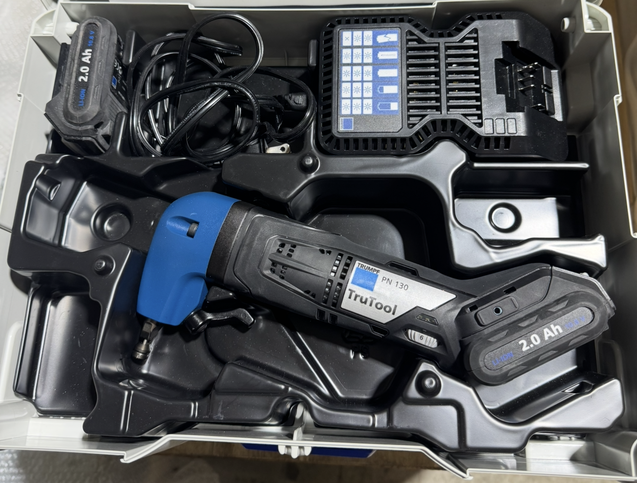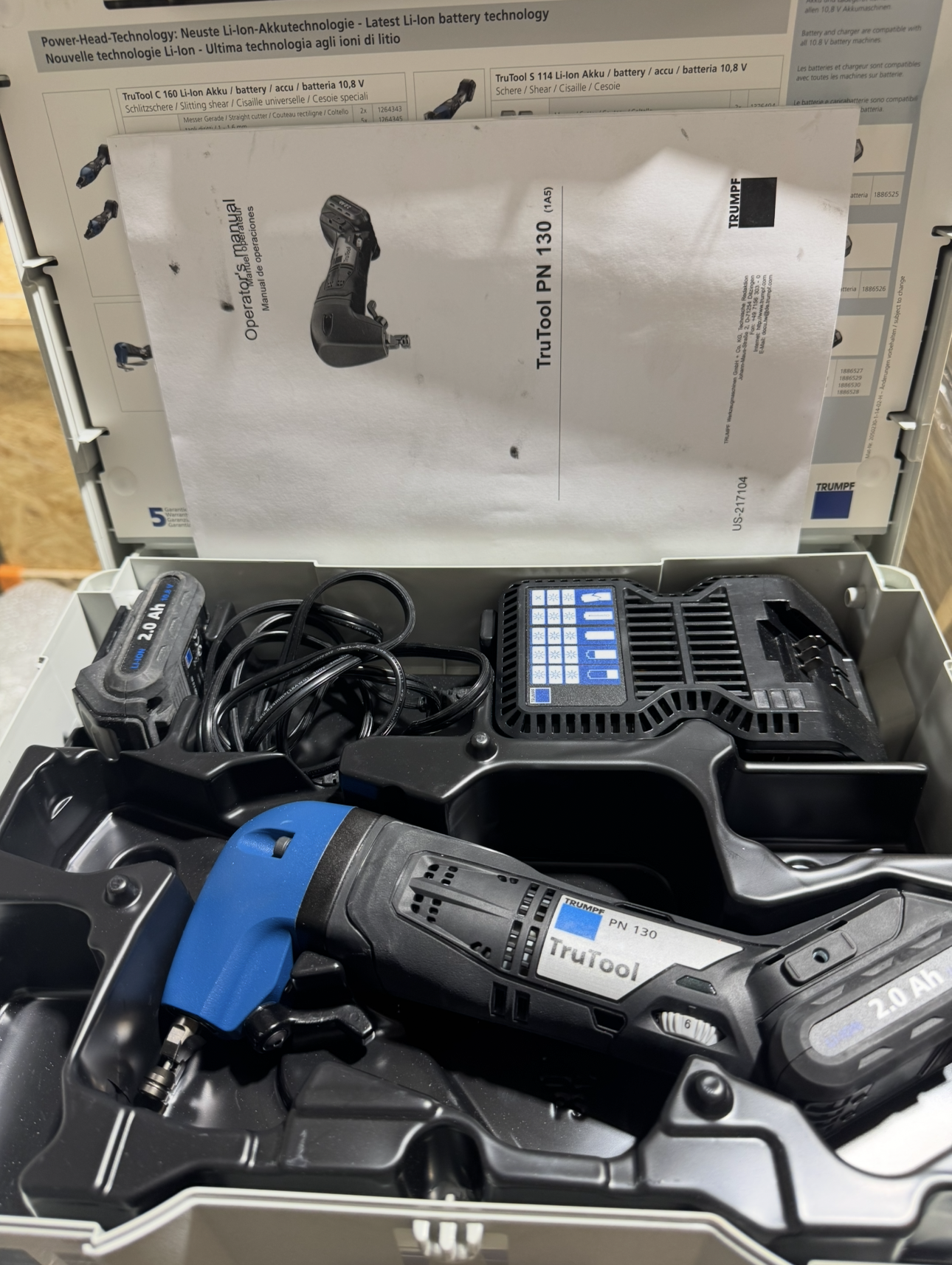 This Trumpf TruTool PN 130is a reliable, easy‑handling nibbler built for tight radii, profiles, and corrugated material. The TruTool PN 130 delivers clean, controlled cuts in sheet metal with quick setup and a compact, ergonomic design, making it ideal for shop or on‑site work.